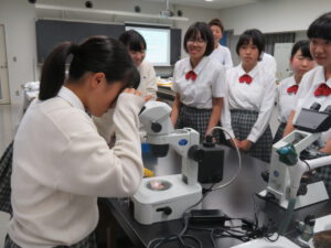 動物応用科学の講座では、獣医学や畜産学とはどのような学問かということがまず話され、動物はどのように人間と深いつながりがあるのか紹介されました。動物応用科学は人類の福祉に貢献し、人間の豊かで健康な生活を支えてくれている学問です。講座の中で、生徒は、豚の精子をマイナス196度で凍結し、溶かして、顕微鏡で見る実験も体験しました。こういった「超低温保存」の技術によって、現実にはまだないタイムマシンが顕微鏡の中では実現する、ということも話され、現在の医療や福祉の進歩に大いに役立っている事を知りました。