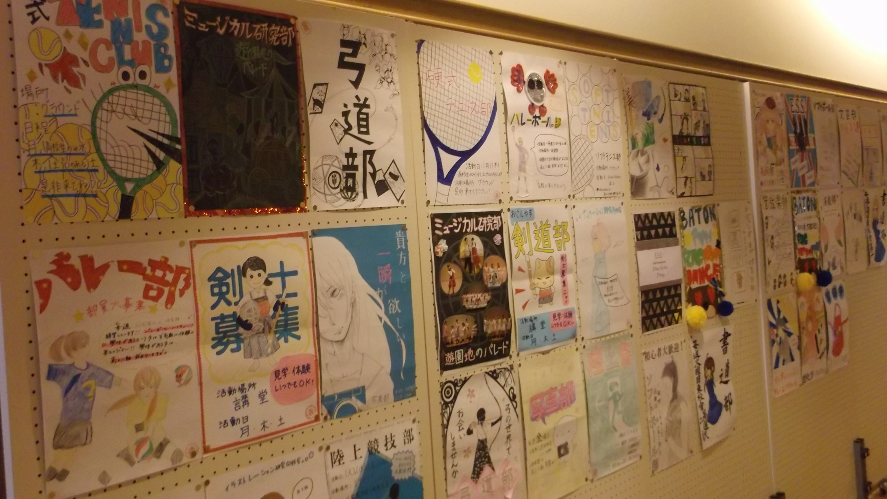 現在、中等部1年生は、クラブの見学期間です。プラザには、各部が作成したポスター・案内が掲示されています。これから興味のある部に仮入部し、雰囲気をつかんでいきます。学園生活がますます楽しくなることでしょう。(生徒会 山田)