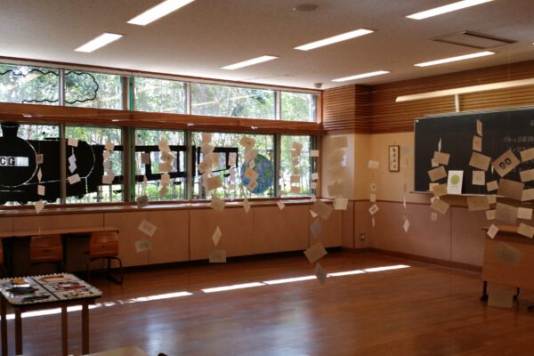 中1ろ組の教室では中等部1年生や在校生、教員が描いた作品が飾られています。