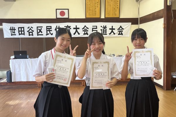 9月14日(日)世田谷区立総合運動場内弓道場で行われた第75回世田谷区民体育大会(弓道)で中等部2年生の弓道部員3名が中学生の部において第2位、第4位、第5位に入賞しました。合宿や夏の稽古の成果が出始めています。これを励みに次は1月の都大会でも実力を発揮し、入賞してほしいです。