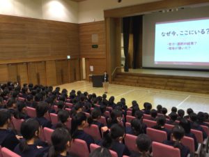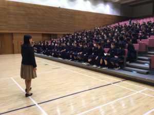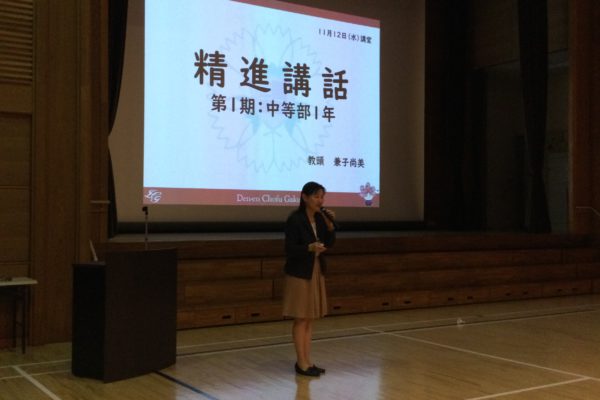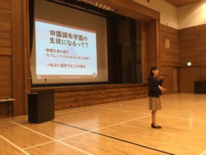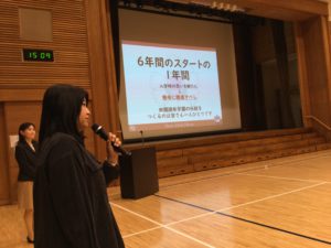 田園調布学園の生徒になったなあ、という瞬間については、あらかじめアンケートがあり、結果がスクリーンに映し出されました。「制服を着たとき」や「なでしこコンシェルジュとして受験生に説明をしたとき」などの答が多く、制服を着たから本校の生徒になるわけではなく、中身を含めて本校の生徒になってほしい、との話がありました。本校には99年の伝統があり、変わらないものも多いが、与えられた環境は自分で変えていくこともできる、という話もありました。