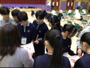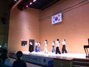 文化交流会では、韓国・日本ともにダンスパフォーマンスを披露しました。キョンヨン中学校のダンス部の皆さんによるk-popダンスに、生徒たちは目を輝かせていました。自分たちがソーラン節を披露した際には少し照れ臭かったようですが、精いっぱい元気に踊っていました。 暫しの休憩の後、K-poダンス体験の時間に。この日のためキョンヨン中学校が招いてくださったダンスの先生にしっかりレッスンをしていただきました。全員2名ずつペアを組み、教え合い、助け合いながら1時間半練習を行い、無事に1フレーズを音楽に合わせて踊り切ることができました。