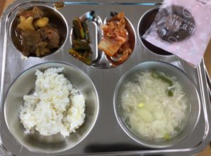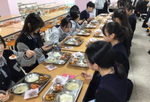 お昼は食堂に移動して、みんなで給食をいただきました。今日のメニューは、きびごはん・韓方サムゲタン・豚カルビの煮つけ・ニンニクの芽のコチュジャン和え・白菜キムチ・しっとりチョコクッキーでした。いつも通りの給食にお邪魔させてくださいとお話ししましたが、現地の生徒いわく「スペシャルメニュー」だということでした。とても美味しい食事に生徒たちも大喜びでした。