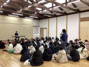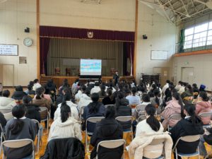 朝食後、生徒たちは大沢コミュニティセンターに移動して、合同会社COCOSATO代表の阿部彩人氏の講演を聴講しました。阿部氏はドラマ、楽曲などエンタメコンテンツの製作の経験を通して、酒田の魅力を発信し続けてこられた方です。また、2024年7月に酒田市に甚大な被害をもたらした豪雨災害からの復興にも尽力され、現在は酒田市大沢地区に住みながら、地域おこしをされています。人口が減少していく酒田市の地域づくり、地域おこしには「ないものねだり」ではなく「あるものさがし」をし、それを磨くことで、地域の持つ特徴や絆を(楽しく)発信することが大切だと語られました。生徒たちも真剣にメモを取りながらお話を聴き、質問も多く出ました。豪雨災害の時は、阿部氏も大変落ち込まれたそうですが、大沢地区の方々と話をする中で、どの方も後ろ向きなことを言わなかったことに逆に励まされたというお話が印象的でした。