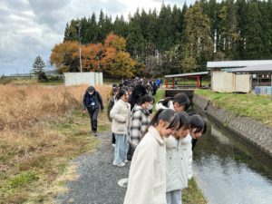 昼食後、牛渡川・丸池周辺の散策を行い、鮭の孵化場を見学しました。鳥海山の湧水を水源とする美しい川の流れに乗って、毎年多くの鮭が、卵からかえったこの場所に戻ってきます。川の水は澄み切っており、鮭の他にもヤマメなど多くの魚が泳ぐ様子も見ることができ、生徒たちは喜んでいました。孵化場には多くの鮭トバが干されていたものの、今年は遡上する鮭の数がとても少なくなってきているそうで、組合の方が危機感を募らせていました。海水の温度上昇など地球規模の環境変化が喫緊の課題ですが、それを肌で感じる瞬間でした。