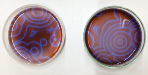 Belousov-Zhabotinsky反応(ベロウゾフ-ジャボチンスキー反応、以下BZ反応)という反応について研究している高等部生4名が、ポスター発表を行いました。BZ反応とは、マロン酸などの有機酸が臭素酸イオンによって徐々に酸化される反応です。この一連の反応中で有色の鉄を中心とした錯イオンが酸化・還元反応を繰り返すため、図のような変色を伴う振動反応が生じます。