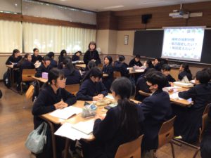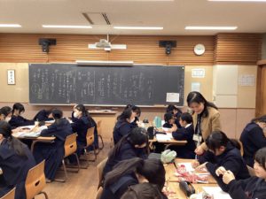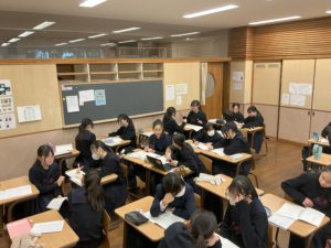 「如是集」から「澄む月に虫の音 はたと止みにけり」(試みにこれの下の句をつけてごらんなさい)という題材を取り上げ、情景を想像しながら自分で考えた句を、お互いに話合いました。より深く鑑賞・創作するにあたっては、作者の意図を探ってみようとすることの大切さにも触れ、川村先生の略年譜を見ながら「捨我精進」に至るまでについても簡単に紹介しました。最後に、言葉で表現できることと表現しにくいものの境目について考えたことを各自がまとめ、自分の思いを伝えるときの留意点を整理しました。