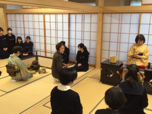 「作法」のうち、和作法室での授業は9月~10月に「席次」「座礼」「物の受け渡し」「食事の作法」を学び、2月にはその集大成として裏千家の抜山宗邦先生、荒川宗知先生のご指導の下、お茶席体験をしました。
