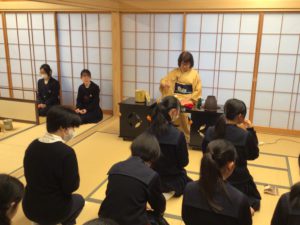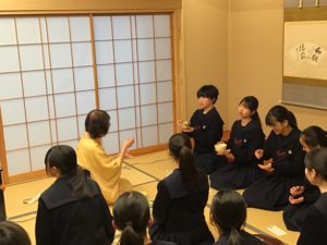 生徒は真剣な面持ちでお点前を拝見しながらお菓子とお茶をいただきました。その体験からの気づきを生徒のコメントを引用して紹介します。