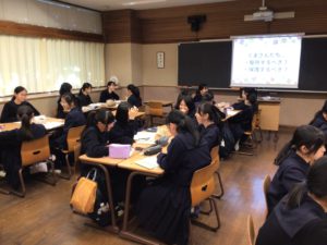 「如是集」から「澄む月に虫の音 はたと止みにけり」(試みにこれの下の句をつけてごらんなさい)という題材を取り上げ、情景を想像しながら自分で考えた句を、お互いに話合いました。より深く鑑賞・創作するにあたっては、作者の意図を探ってみようとすることの大切さにも触れ、川村先生の略年譜を見ながら「捨我精進」に至るまでについても簡単に紹介しました。最後に、言葉で表現できることと表現しにくいものの境目について考えたことを各自がまとめ、自分の思いを伝えるときの留意点を整理しました。