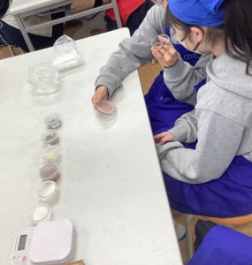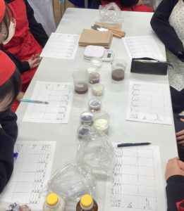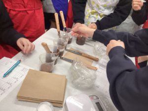 油分の多いチョコレートと、水分の多い生クリームを混ぜて乳化させる上で一番ベストな配合を探すため、5つの班に分かれて実験を行いました。