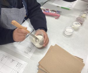 それぞれの班で、指定されている量の生クリームを、チョコレート100gに加えて混ぜていきます。