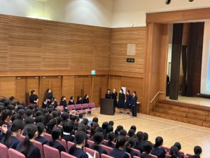 舞台脇で司会を務めたのは取り出しクラスの生徒たち。司会のみならず、途中で取り出しクラスの代表者による動画作品の上映がありました。熱海への小旅行を撮影しナレーションと字幕をつけたビデオ(vlog)や、軽音楽部での活動を英語で紹介したビデオを視聴し、普段取り出しクラスがどのような学習を行っているのかを知ることができたようです。