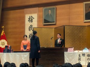 学校長からは、この学年は中学校生活はコロナとともに始まったこと、当たり前だったことができなくなったが、だからこそ「捨我精進」をまさに体現してきた世代だと語られました。