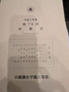 本日、第78回高等部卒業式が行われ190名が巣立ちました。卒業生は、1人ずつの呼名にこたえて返事をし、壇上で証書を受け取りました。