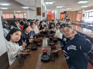 菅平高原に到着後、午後から始まる講習に向けてまずは腹ごしらえです。中にはおかわりをする生徒も。楽しく食べて、親睦を深めました。