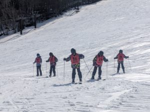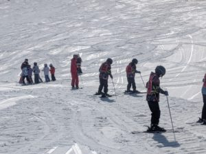 午後には早速、レベルごとの班に分かれ、講習が始まりました。初めてスキーに挑戦する生徒たちは、緊張と楽しみが入り混じった面持ちでゲレンデに向かいます。