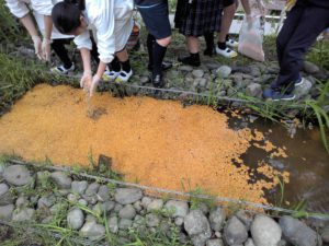 土入れが終わった後、藻や草を再度取り除き、6月、ついに田植えです!稲の苗は、中等部2年生の学習体験旅行でお世話になっている山形県酒田市の農家の土田様から、山形県で有名な「はえぬき」という品種をいただきました。苗と一緒に送ってくださった肥料を撒き、教えて頂いたアドバイスをもとに、初めての田植えを体験しました。