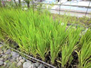 その後は、順調に稲が育ちました!週2日の活動日に水温と水深、pH(物質の酸性・アルカリ性を表す単位)を測り、稲に適さない数値になっていないか確認しました。夏休みには、鳥に食べられないように鳥よけを組み立てました。