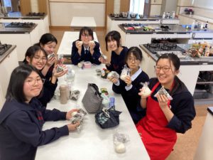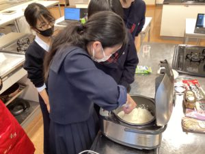 では!お待ちかねの炊飯タイムです!!私達が育てたお米を計量カップを使って測ってみると、なんと、約4合分にもなりました!家庭科室の炊飯器を使って炊き、温かいうちにいろいろな具を入れておにぎりにしました。