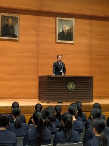 211名の新1年生に向け、校長から捨我精進の心について伝えられました。「学校生活を通じて捨我精進を行動でみせられるような生徒になってほしい。6年間は土台を作る大切な時。今の自分を超えるように精一杯過ごしてほしい。時代は今大きな転換期になっている。社会や世界のことにも関心をもち、挑戦すること。」などが語られました。