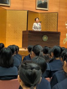 211名の新1年生に向け、校長から捨我精進の心について伝えられました。「学校生活を通じて捨我精進を行動でみせられるような生徒になってほしい。6年間は土台を作る大切な時。今の自分を超えるように精一杯過ごしてほしい。時代は今大きな転換期になっている。社会や世界のことにも関心をもち、挑戦すること。」などが語られました。