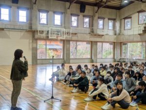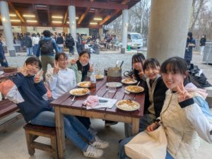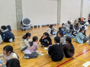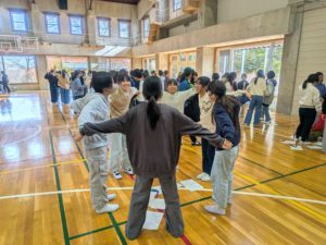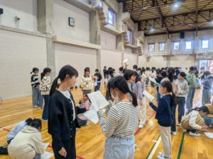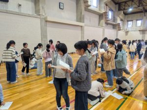 PAプログラムでは、「野生動物に出会ったことがある」「テントで寝たことがある」など友達に質問し、「はい!」だったらサインをもらう、というトレジャーハンティングというゲームや、「おにぎりの具と言えば?」という問いにみんなで「○○!」と答え、同じだったりちがったりすることを楽しむゲームで盛り上がりました。クラスの友達との距離が一気に縮まりました。