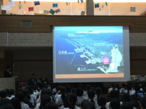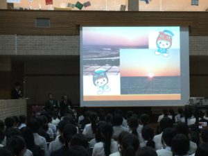 始めに農政課の住石さんから、酒田市は日本地図のどの位置で、どのような地域なのか、特産物には何があるかなどの説明をして下さいました。きれいな夕日の写真に感動しました。