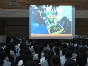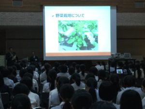 生徒から、田んぼや畑の広さはどのくらいあるかのと質問があり、田畑は東京ドーム13個分の広さがあり、今は株式会社を設立して家族だけでなく、人を雇って農業をしている生産者もいることがわかりました。