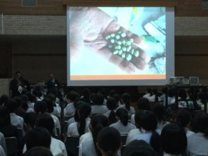 副委員長の堀さんは、中2生が、家庭でこれから栽培する枝豆としそ栽培のコツを教えて下さいました。