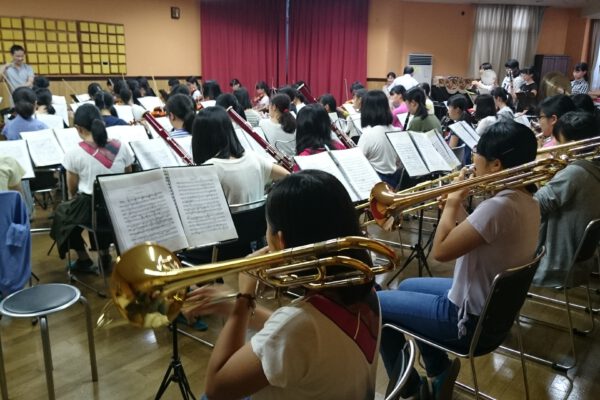 今回は管弦楽部を紹介します。管弦楽部では28日から4日間河口湖近くで合宿を行っています。朝は6時から夜は10時まで1日計約9時間みっちり練習しました。勉強のことは忘れ音楽のことだけを考えて過ごす4日間、部員はみんなとても充実した時間を過ごしました。写真は合奏を行っている時のものです。各パートのトレーナーの先生に来ていただき、熱い指導を受けました。今回新たに見つけた課題を残り1カ月で仕上げ、 なでしこ祭本番でのよりよい演奏を目指します。なでしこ祭では、「威風堂々」を含む5曲を演奏します。