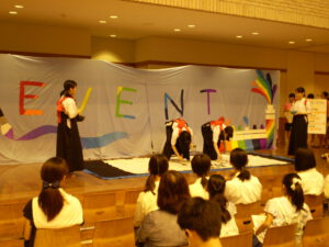 今日はなでしこ祭2日目です。プラザでの書道部の発表では、色を使った書道パフォーマンスが行われました。立って書くのは難しいと思いますが、上手に書けていてきれいでした。来場者の方も喜んでくださったようです。