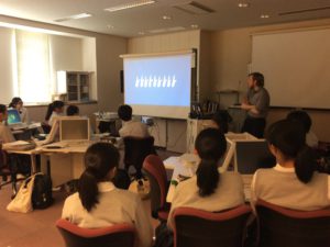 土曜プログラム 高1「語学を通して世界を知る」アメリカ英語では、映画を切り口としてアメリカ文化、また日本の文化との違いを学びます。今日は、日本の文化を英語で説明できるように、と、1時間目は、ワークシートでグループごとに映画に出てくる単語(「Spirit」「Temple」「Dust-bunny(まっくろくろすけ)」)と英語の構造を知る単語(「Theme」「Frame」「Voice acting」)などの日本語訳を書きました。また、「しょうがない」「注連縄」「木霊」などの英語訳も試みました。「注連縄」などは、日本語としての説明も調べる必要があり、また「木霊」も単に「echo」では、 interpretationと言えず、生徒たちはそれぞれクロームブックも使いながら、工夫をしていました。
