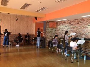 弦楽器は広いスタジオで円座になって練習をしています。弓をしっかり使って練習をしていました。中学2年生も初めての合宿を楽しんでいるようです。